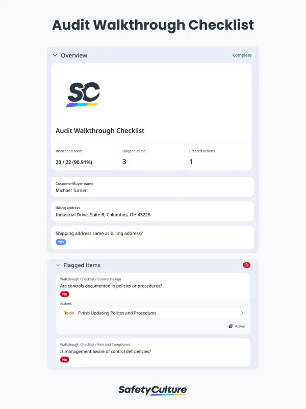 An audit walkthrough checklist helps teams enhance operational effectiveness in real-world scenarios. To know what this looks like, here’s a filled-out sample PDF of an audit walkthrough template:
