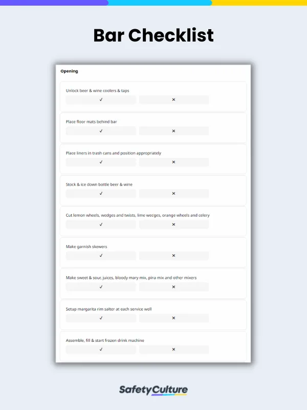 A bar checklist helps bar owners, managers, and staff operate their businesses more efficiently. It also includes procedures, duties, and best practices on a day-to-day basis. A general bar checklist consists of: