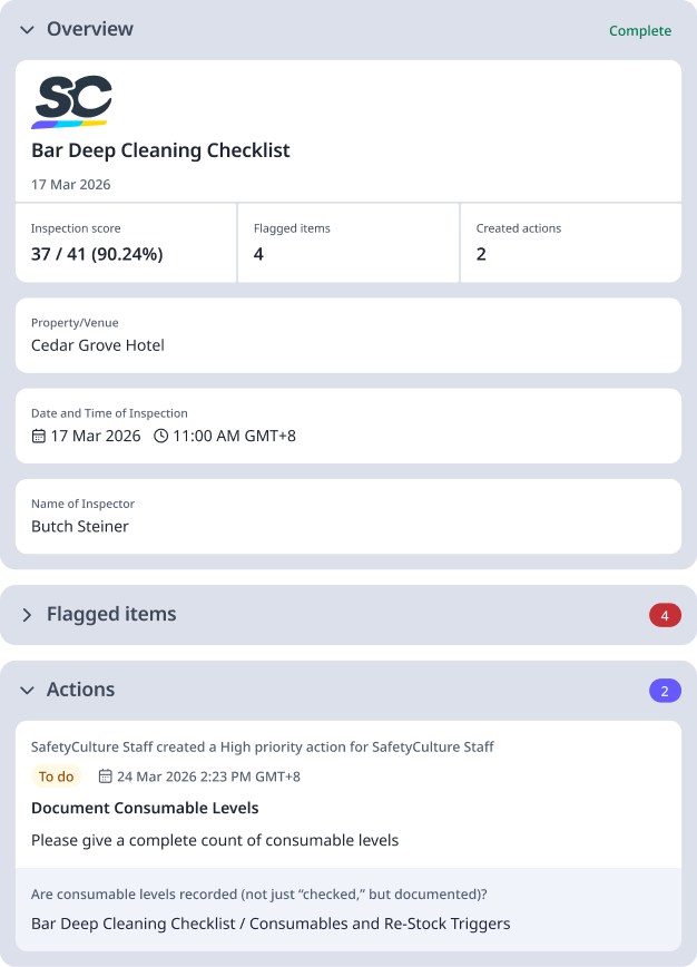 A bar checklist for deep cleaning must include sanitation checks, completion logs, and documented evidence for all designated areas and equipment. Here’s a brief guide on checklist items required: