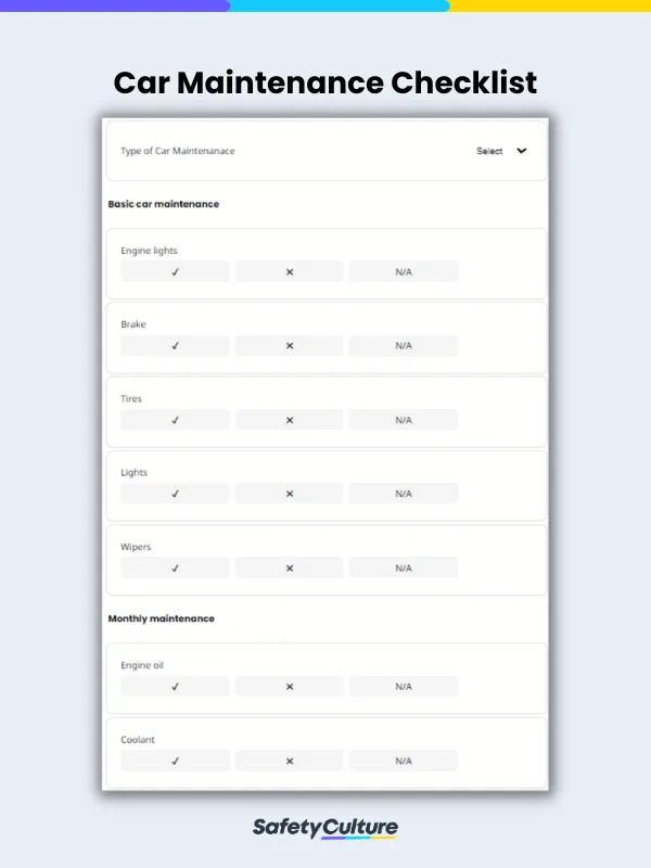 A car maintenance checklist, also called a vehicle maintenance checklist, is a tool used by auto service technicians to keep track of car service schedules and eliminate unexpected defects and engine breakdowns. It helps prolong the operational condition of a vehicle, ensure roadworthiness, and promote safety by proactively catching issues before accidents can occur. A basic car maintenance checklist includes inspection of the engine lights, brake, tires, lights, and wipers.