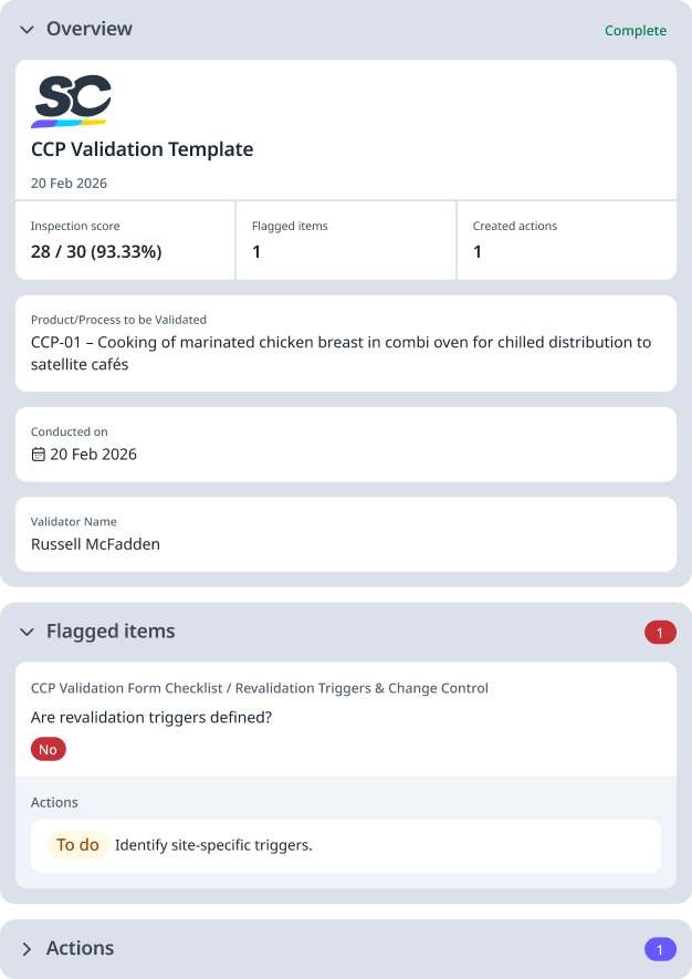 A CCP validation template is a structured tool used in food safety systems to check if critical control points (CCPs) in your HACCP system are effectively keeping food safe. It logs evidence that compliance with CCP limits and requirements successfully prevents bacterial growth and other food safety hazards.