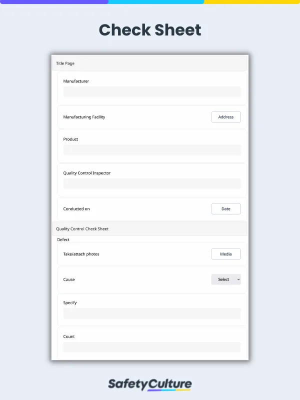 Check sheets enable frontline workers to capture and compile data in a consistent manner, interpret results, and observe trends over time. Quality control inspectors can utilize mobile-ready check sheets to easily classify product defects, identify the cause of quality issues, and implement effective manufacturing process improvements.