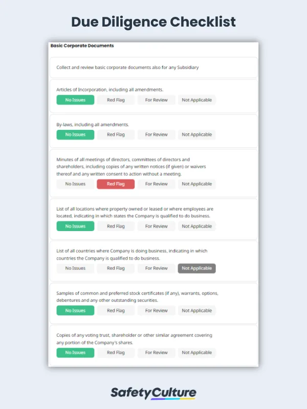 Indicate the status of the items – Specify if checked items have no issues, are a red flag, need review, or are not applicable at the time of your due diligence audit. This would emphasize business aspects that need to be addressed and highlight issues you could factor in on the assessment of the company/product.