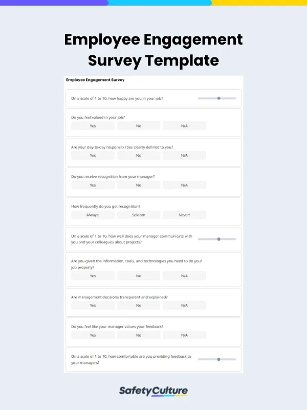 An employee engagement survey template is a Human Resources (HR) tool containing a pre-designed set of questions used to gather feedback from employees about their level of satisfaction, experience, and overall workplace engagement. This typically includes questions related to areas such as job satisfaction, career development, company culture, communication, and leadership to provide insights to organizations about how they can improve their programs and operations.