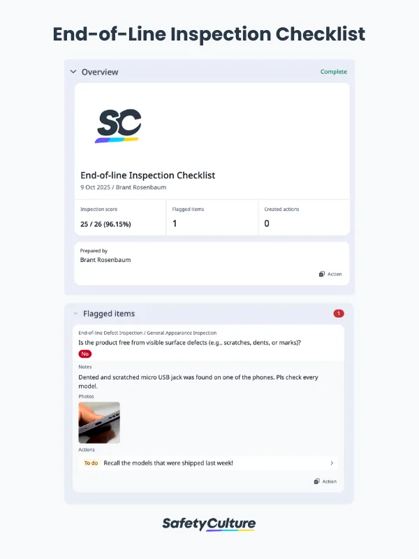 An End-of-Line (EOL) inspection checklist is the final quality control step of a production line that a finished product must go through. It’s a step-by-step tool used in manufacturing to ensure that finished goods meet all safety and quality standards before being shipped to customers. A digital checklist can help streamline this process through automated logs, scheduled maintenance, real-time monitoring, and employee training, catching quality issues early and helping prevent customer complaints.