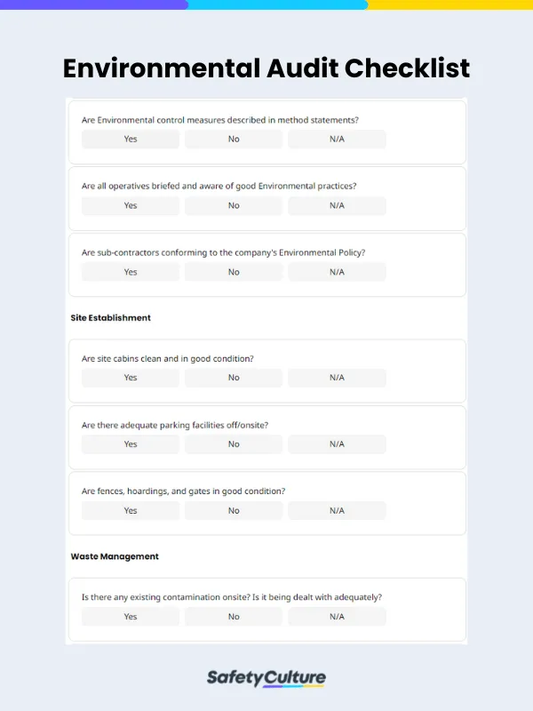 Environmental Audit – allows you to answer Yes-No-N/A questions regarding the organization’s environmental policy, control measures, waste management practices, and other related aspects