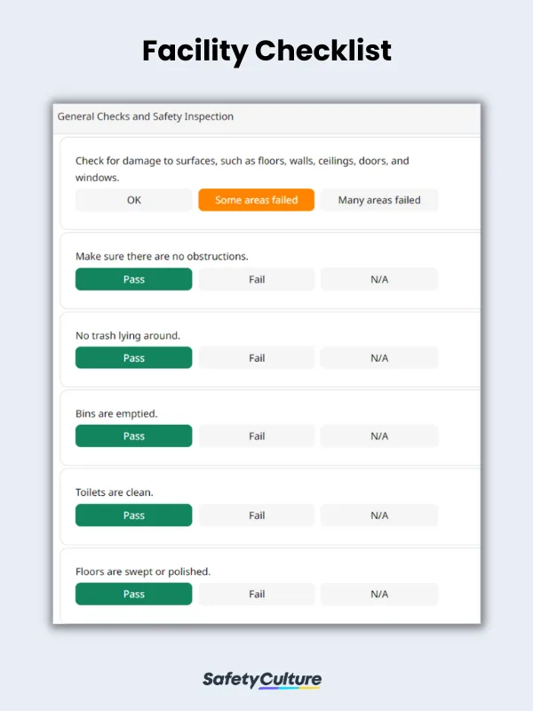 The checklist must also let you inspect the condition of the facility’s physical environment. This may cover surface damage to floors, walls, ceilings, doors, and windows. Also, lighting, ventilation, and cleanliness are checked.