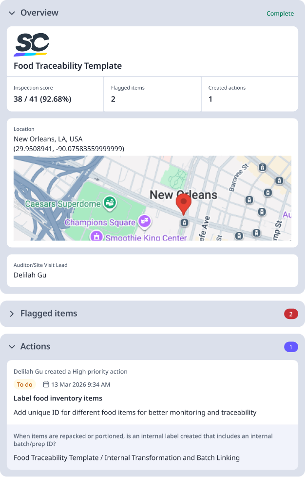 Recall workflow: It is important to have a dedicated section to confirm that a recall/hold trigger workflow is in place. One of the objectives of effective food traceability is being able to quickly identify and isolate noncompliant items for easy removal.