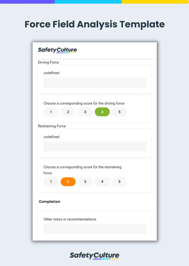 A force field analysis template is used to help teams in listing forces that are for and against a proposed change or solution, analyzing such forces via a scoring system before considering for implementation, and providing recommendations for the next steps to take based on the results of the analysis.