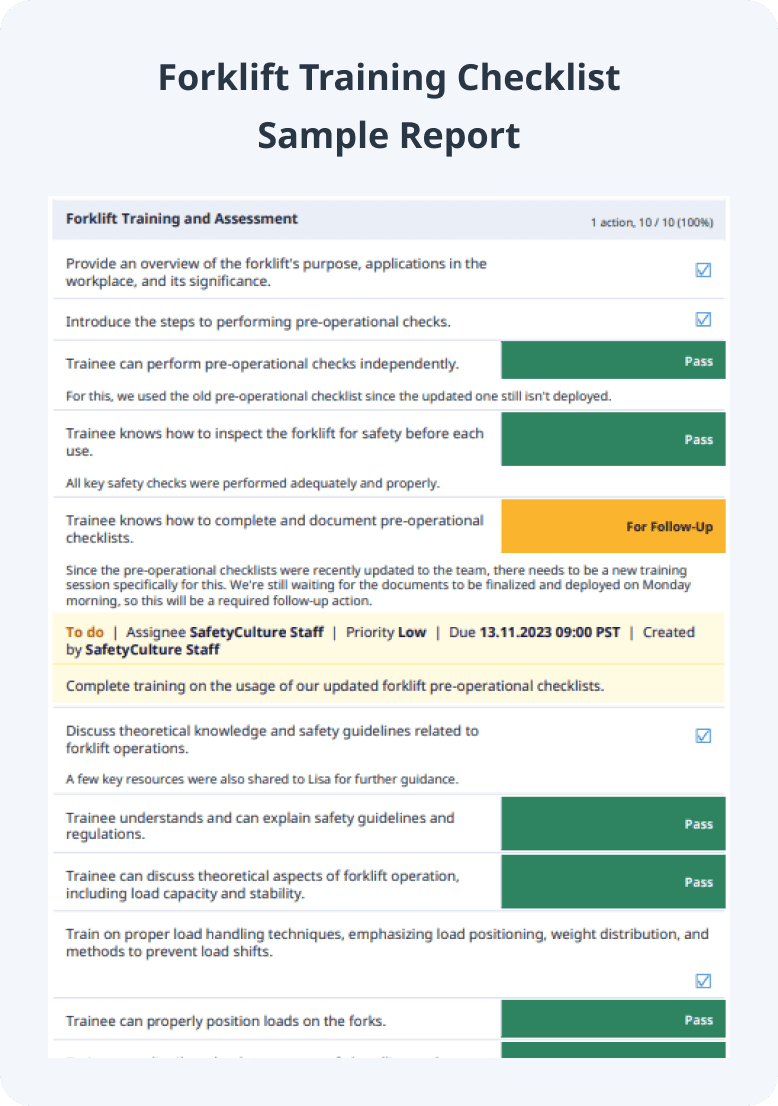 Document the trainee’s ability to perform pre-operational checks, ensuring they can inspect the forklift for safety before each use.