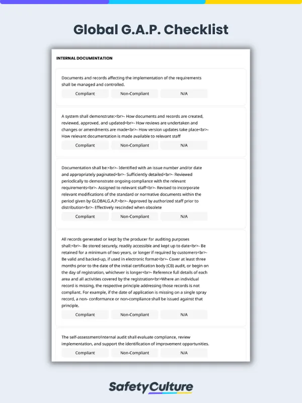 Moreover, a GlobalG.A.P. checklist is a useful tool for ensuring consistency in carrying out good agricultural practices. Checklists help streamline the internal audit process so that auditors can focus on assessing current practices, spotting nonconformities, and developing ways to address them. In turn, this systematic approach can help: