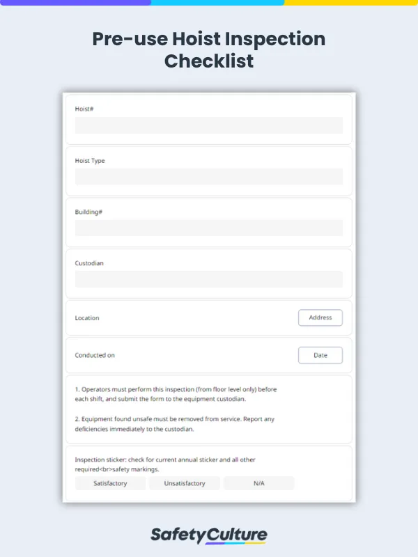 Overly complex inspection checklists that have too many steps may end up being skipped altogether due to the hassle of completing them. Make sure that your inspection checklists ask for only the most relevant information so you can keep them short but effective. Download free pre-made hoist inspection checklists here or customize them to fit your business needs and preferences.