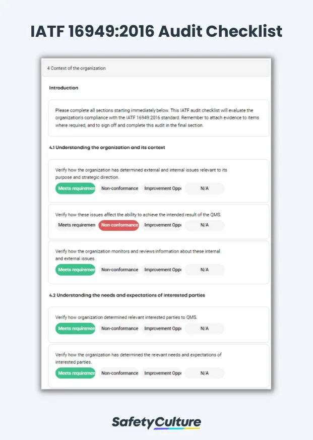 An IATF audit is the process of evaluating an automotive manufacturer’s Quality Management System (QMS) compliance with the IATF 16949:2016 standard. The IATF 16949:2016 standard replaced ISO/TS 16949 and it intends to prevent defects, reduce waste, and facilitate continuous improvement.
