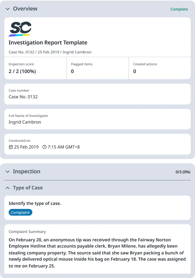 The accuracy of an investigation report lies in its structure. It is also ideal if investigation reports are performed in a tool that allows easy collaboration, documentation in one safe location, and real-time report generation. For example, an effective internal investigation report template follows this format: