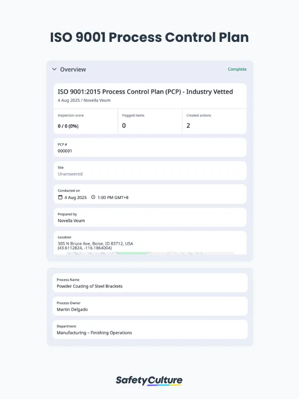 Creating an effective process control plan template requires capturing all elements that influence product quality and process consistency. To meet the requirements of ISO 9001:2015 Clause 8.5, the plan should include the following: