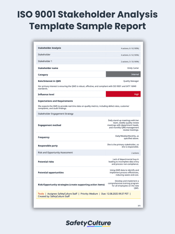 Below is an example of a completed ISO 9001 stakeholder analysis template report for a Quality Management System (QMS) within a manufacturing company: