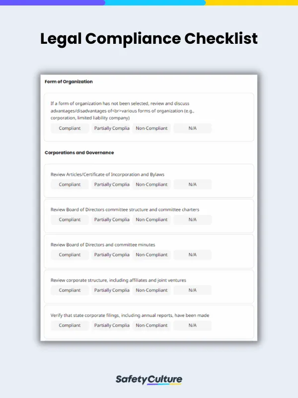 Each organization has different legal regulations they need to follow depending on the nature of their work, their industry, their auditing and compliance programs, and their location. However, a typical legal compliance checklist has fields for ensuring compliance with the following: