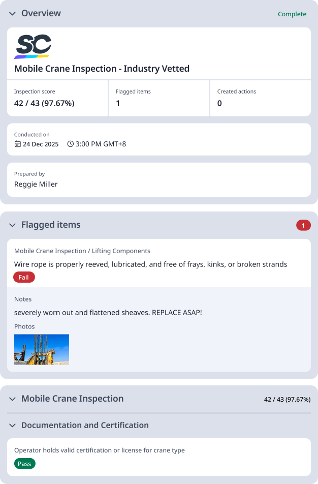 A mobile crane inspection checklist helps your crew check the parts that matter most before any lift. Operators, Quality Assurance (QA) teams and on-site engineers can use it to look over hooks, hydraulic systems and tires so they meet US Occupational Safety and Health Administration (OSHA) 1926 requirements. By running through these checks first with a dedicated checklist, you can spot defects or malfunctions early and prevent accidents on site.