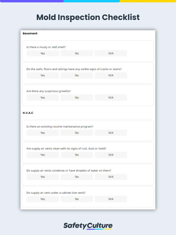 Indoor areas such as the basement, HVAC, kitchen, ceilings, laundry room, attic, and living room are the most common areas inside the house where mold could grow. Do a visual inspection in these areas and answer guide questions in a mold inspection checklist like: