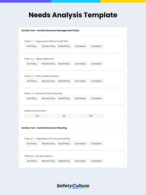 Human Resources (HR) and company policy need analysis templates: Companies are often changing their practices and policies to keep compliant with regulations and ensure the safety and well-being of their employees. For this reason, a needs analysis is often used to help HR professionals, managers, and business owners to better identify points for improvement in their leadership and their team or organization’s workings.