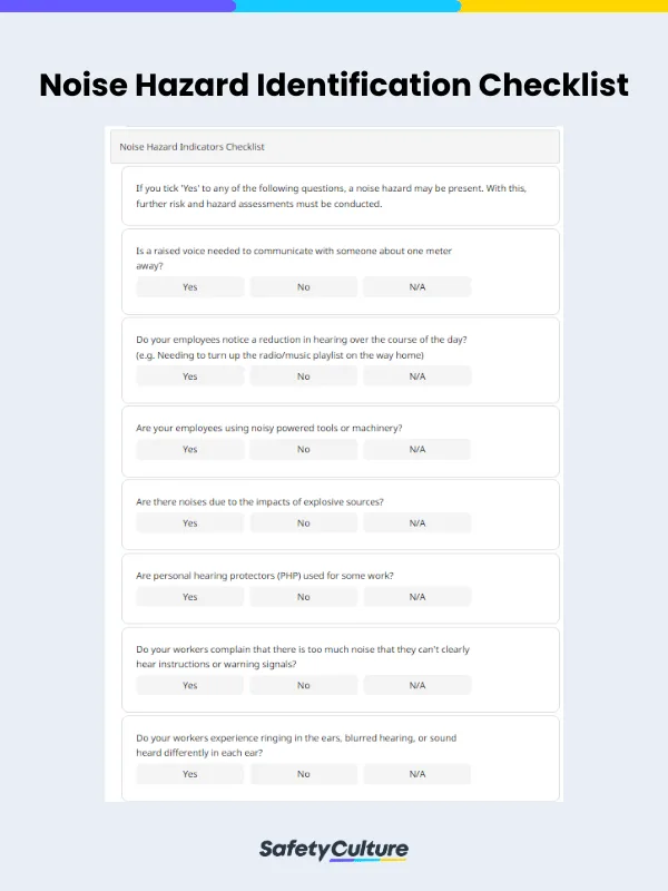 Answer Yes-No-N/A questions to identify potential noise hazards.