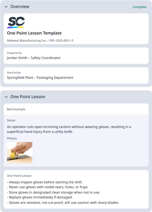 Use a one point lesson template . Why use a template? Other employees can use the same template for future one point lessons. By promoting the use of this template in your organization, you’re also standardizing the structure and process of making OPLs.