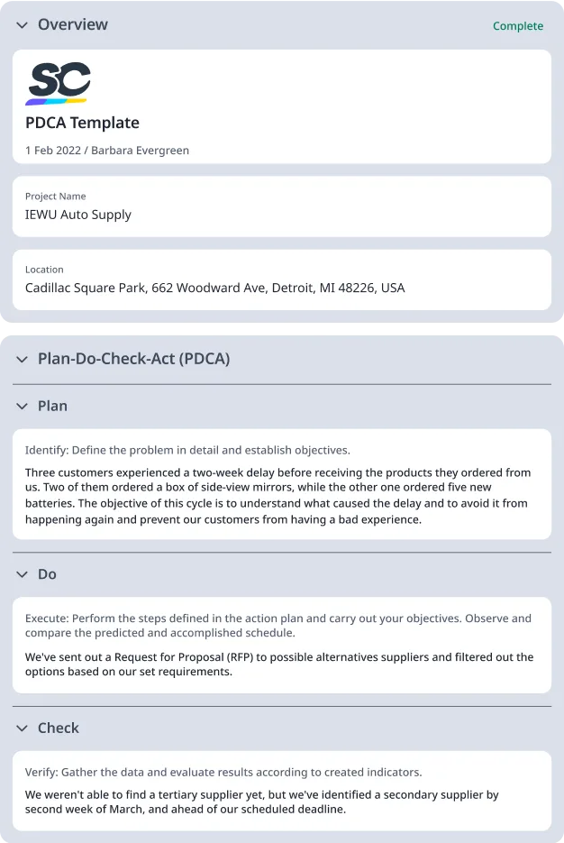 What should be included in each section of a PDCA template? To provide you with a clearer picture of how PDCA can be used to improve your operations, here’s an example: