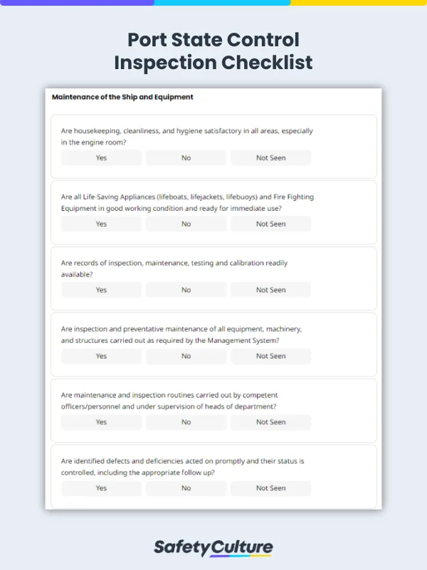 A port state control inspection checklist is used by the Captain (or Master) and officers on board to easily identify deficiencies, implement corrective actions, and demonstrate the compliant condition, operation, and manning of the ship.