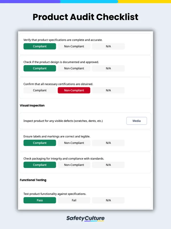 This checklist serves multiple important functions in product audits, including quality assurance, quality control, and product safety. The tool provides structure for this process, making it easier to assess if products meet quality standards and customer requirements. This way, organizations can minimize manufacturing defects before products hit the market and enhance customer satisfaction with their products.