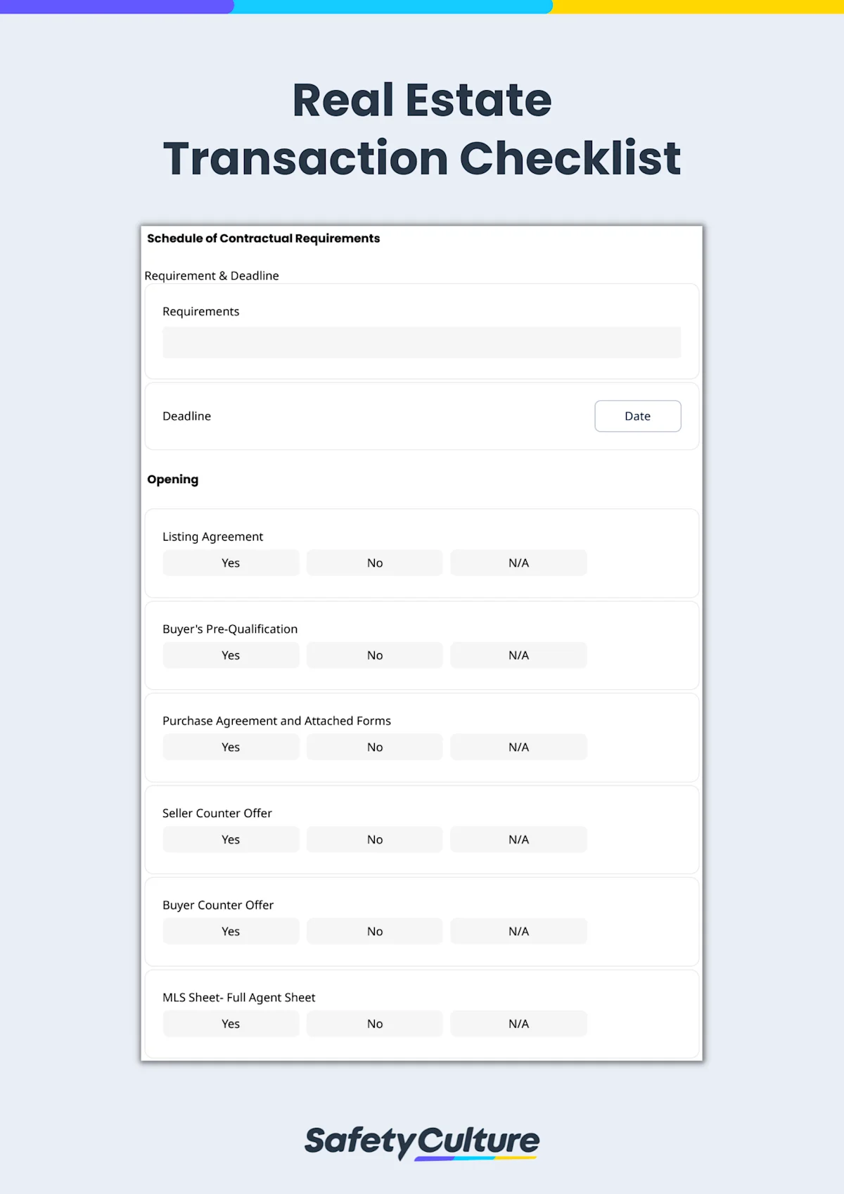 A real estate transaction checklist helps facilitate a simpler, fairer, and timely sales process for both buyer and seller. This tool can be used by transaction coordinators, realtors, and escrow officers to ensure that all parties are in compliance with contractual obligations, as a breach in real estate contracts can result in lengthy court battles and costly lawsuits.