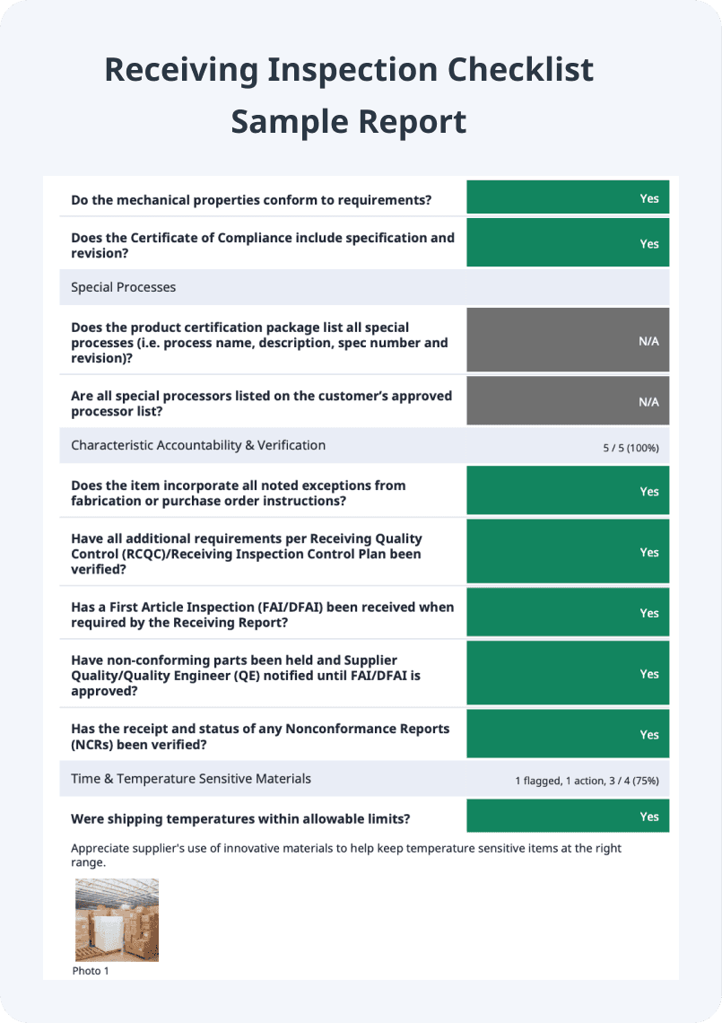 For reference, here is an example of a filled-out receiving inspection checklist report: