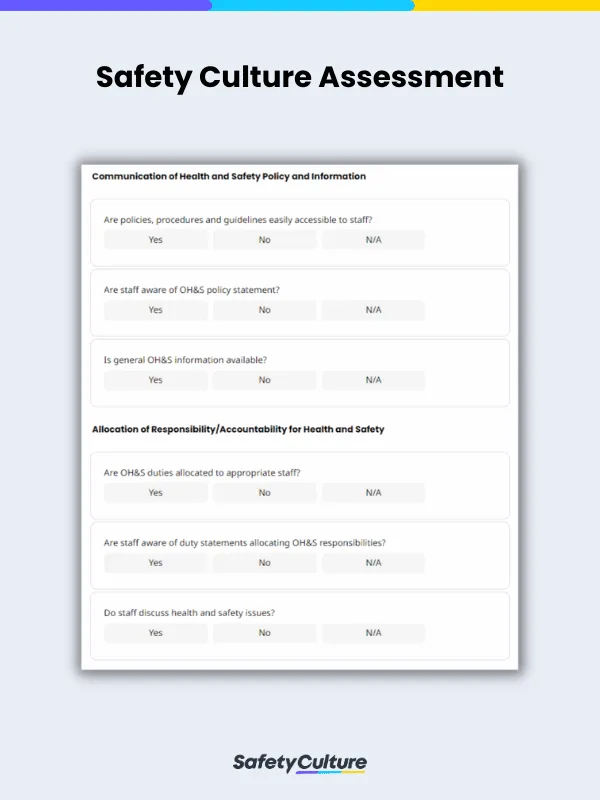 To measure safety culture and all the efforts that go into it, an assessment is often done in the form of a survey, questionnaire, checklist, or observational report. With a safety culture assessment, you can inspect if your organization and workplace are ensuring a culture of safety as intended and if there are any points of improvement.