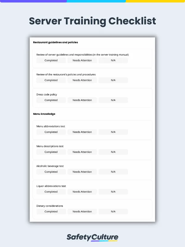 A server training checklist should cover the following key components: