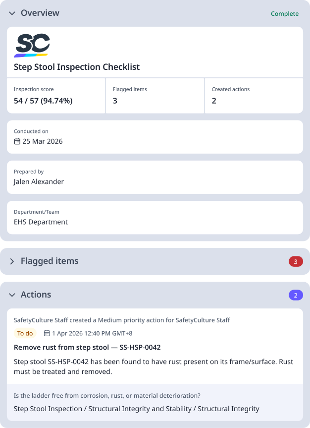A step stool inspection checklist needs to look into each component of the equipment, leaving little doubt about the stool’s integrity. As a digital checklist, it should also store records to confirm compliance and proof of completed inspections. With this, here are the fields that a step stool safety inspection checklist should have: