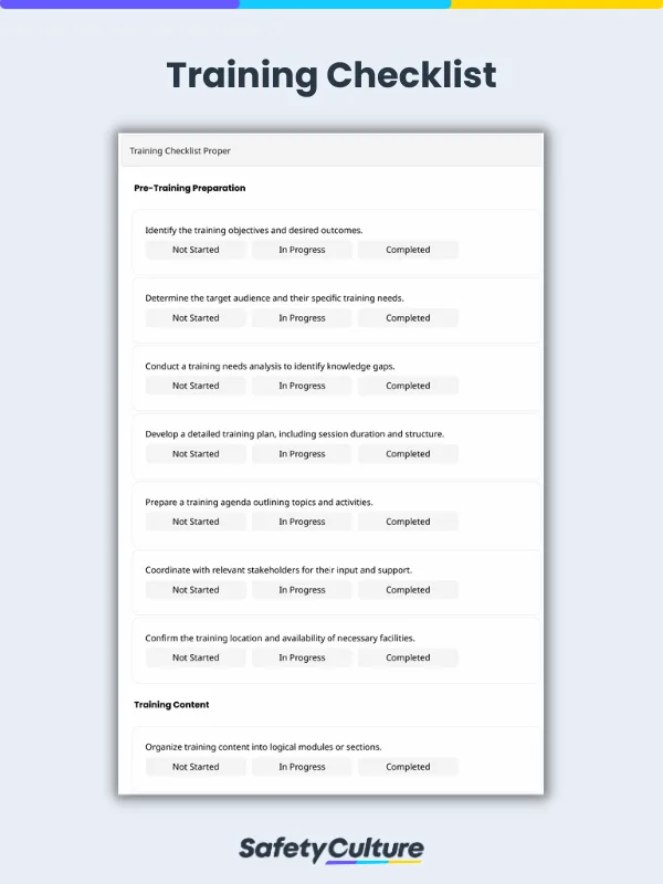 This type of training checklist helps develop and organize the training content and structure. By using this checklist, trainers can align their content with the learning objectives and curate a productive learning experience for participants. Here are a few items to get you started with building this checklist: