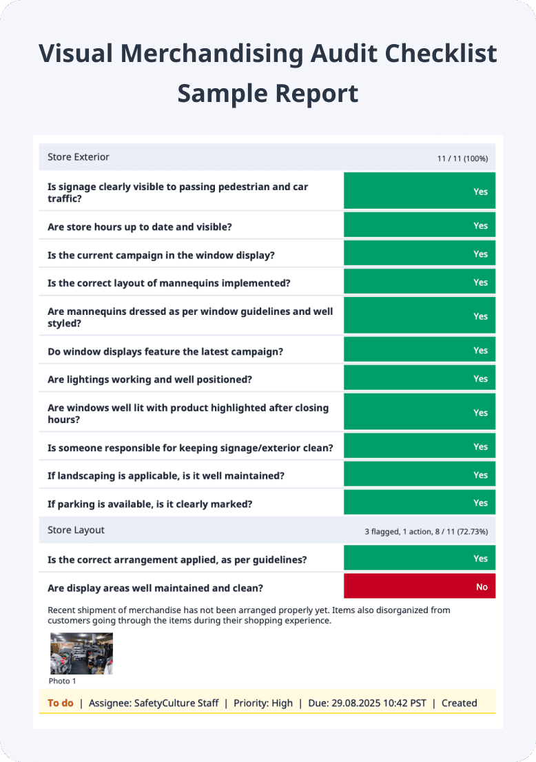 For reference, here is an example of a filled-out visual merchandising checklist report: