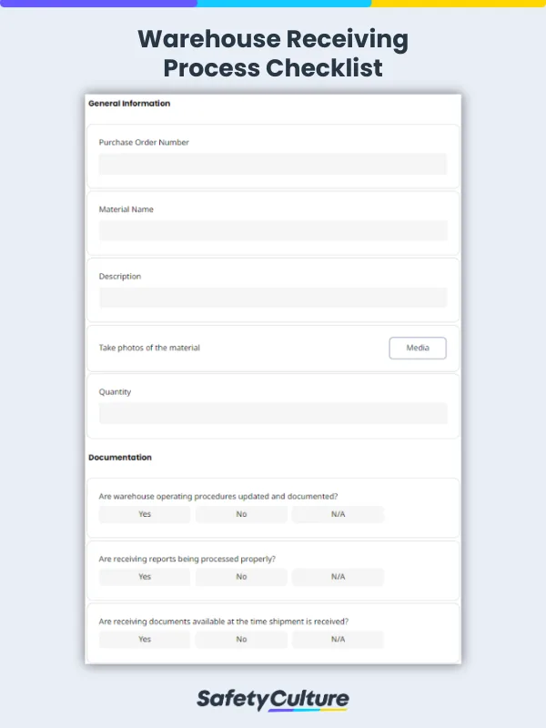 A comprehensive warehouse receiving process checklist contains a step-by-step guide on what to ask and check for when receiving, unloading, and storing newly-delivered items. It also helps in proactively identifying if there are discrepancies in the quantity and quality of the items, allows for proper documentation, and helps in spotting any irregularities with the whole process.