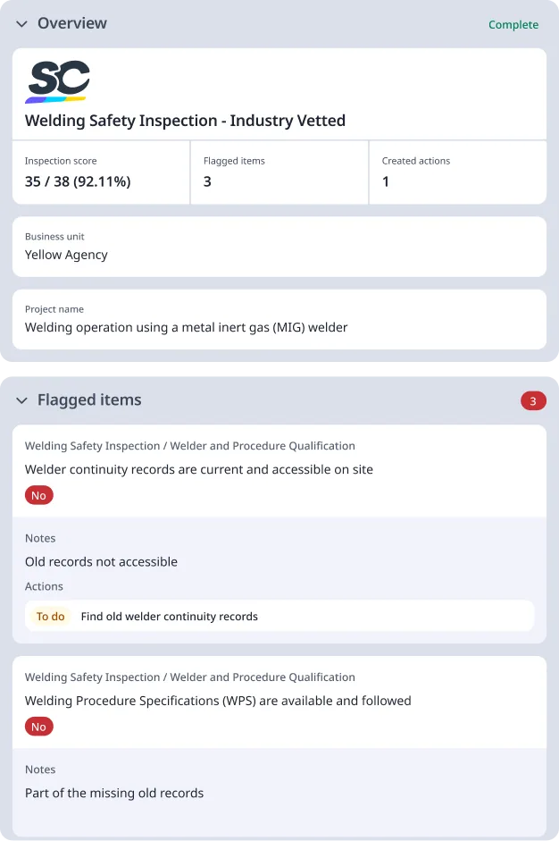 A welding safety checklist is a tool used to assess workers’ safety throughout the entire welding, cutting, and brazing processes. It helps ensure compliance with regulatory standards including wearing of appropriate Personal Protective Equipment (PPE), welding equipment usage, and machinery inspections. A welding safety checklist can also be used when performing site walkthroughs that help record the ventilation systems condition, flammable materials on site, and welding hazards and control.