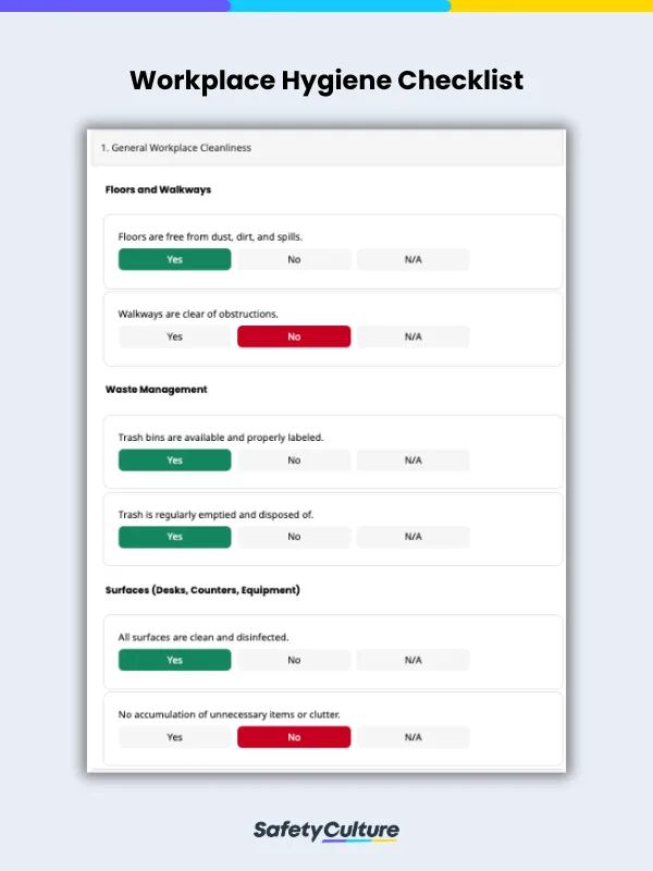 Tailor the workplace hygiene checklist to meet the specific needs of the organization This involves assessing key areas such as restrooms, workstations, and communal spaces, then outlining relevant cleaning tasks. From there, you can now develop a plan on how to improve workplace hygiene.