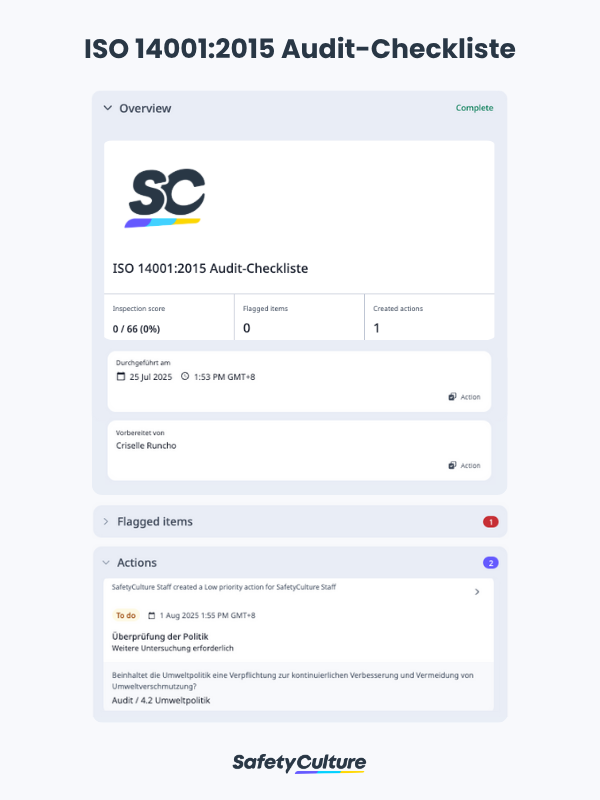 Papierbasierte Prüfungen können mühsam und zeitaufwendig sein. Ersetzen Sie Ihre papierbasierten Audits durch eine digitale Audit-App, um mehr Zeit zu sparen und die Produktivität zu steigern. SafetyCulture (vormals iAuditor) kann Ihnen helfen, bessere interne ISO-Audits durchzuführen, UMS-Aktivitäten zu überwachen und die Umweltleistung Ihrer Organisation zu verfolgen. SafetyCulture (iAuditor) ermöglicht es Ihnen: