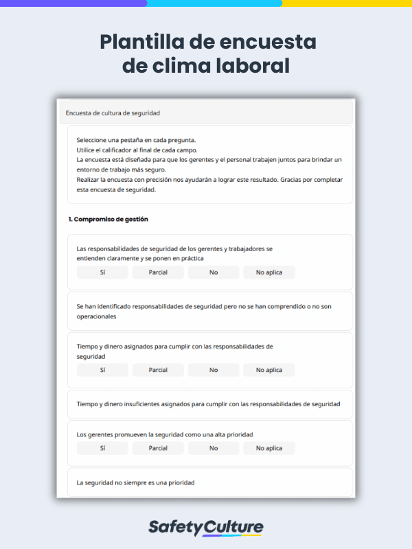 Una encuesta sobre el entorno de trabajo es un formulario que pretende recoger las opiniones de los empleados y empresarios sobre sus entornos de trabajo inmediatos. Esta encuesta abarca las condiciones de trabajo, la cultura y el liderazgo.
