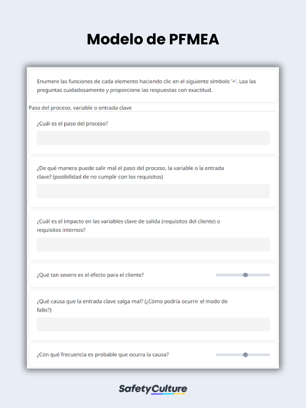Una plantilla de Análisis de Modos de Fallo y Efectos del Proceso (PFMEA) es una herramienta utilizada por las organizaciones cuando llevan a cabo un PFMEA, ayudándoles a identificar sistemáticamente los modos de fallo potenciales, sus causas y sus efectos en los procesos, productos o servicios. Es valiosa para tomar medidas preventivas o correctivas, mitigar riesgos y mejorar continuamente los procesos para garantizar la calidad, la eficacia y la satisfacción del cliente.
