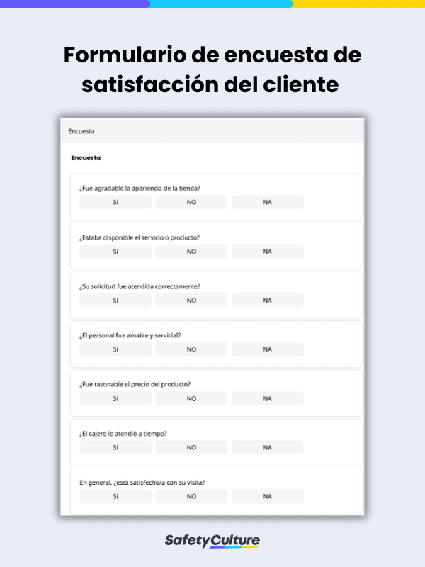 Una encuesta de satisfacción del cliente (o encuesta de satisfacción del cliente) es una herramienta útil para medir el compromiso con la oferta de un producto o servicio. Se utilizan habitualmente en negocios como el comercio minorista, la hostelería, la restauración y los servicios para medir la experiencia del cliente, identificar las necesidades de mejora y evitar el abandono de los clientes.