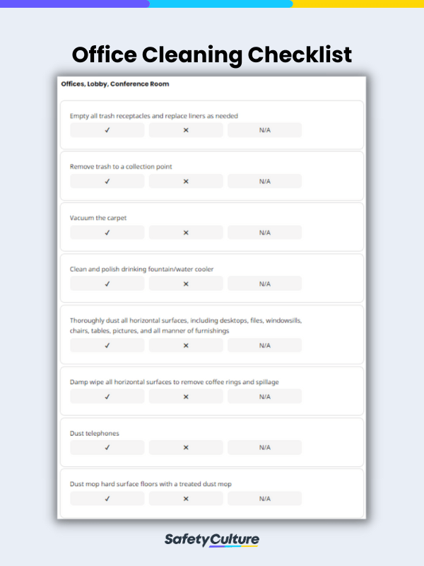 Las organizaciones pueden utilizar listas de comprobación de limpieza de oficinas para mantener los niveles de limpieza. Además, esta herramienta ayuda a garantizar que las tareas de limpieza se realizan de forma coherente, lo que reduce el riesgo de acumulación de gérmenes, fomenta un lugar de trabajo más saludable y mejora la limpieza y la higiene en general.