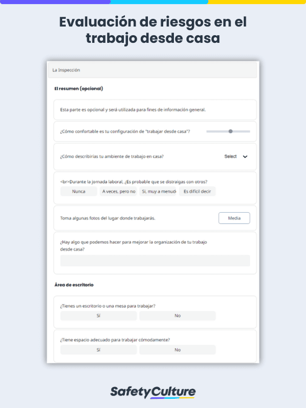 Equipo de trabajo y estación de trabajo : los equipos típicos del trabajo desde casa (como impresoras y trituradoras de documentos) deben usarse correctamente; además, las pantallas de equipos de escritorio o portátiles, los teclados y los ratones deben estar en buen estado para evitar accidentes laborales innecesarios.Una iluminación inadecuada y la falta de control de temperatura también pueden afectar a la calidad del trabajo y a la productividad general, por lo que es importante asegurarse de que el lugar de trabajo doméstico de los empleados esté iluminado y ventilado correctamente.