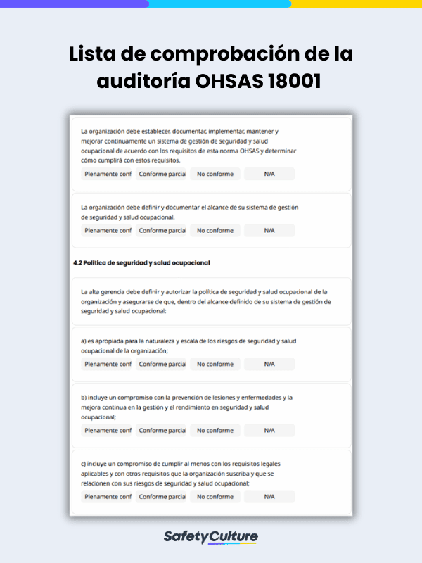 La lista de comprobación de la auditoría OHSAS tiene por objeto confirmar si la organización ha llevado a cabo la identificación de peligros y la evaluación de riesgos para determinar los controles de seguridad que deben aplicarse en el lugar de trabajo. También pretende confirmar si el alcance del sistema de gestión de la salud y seguridad en el trabajo está definido y es conforme a la norma.