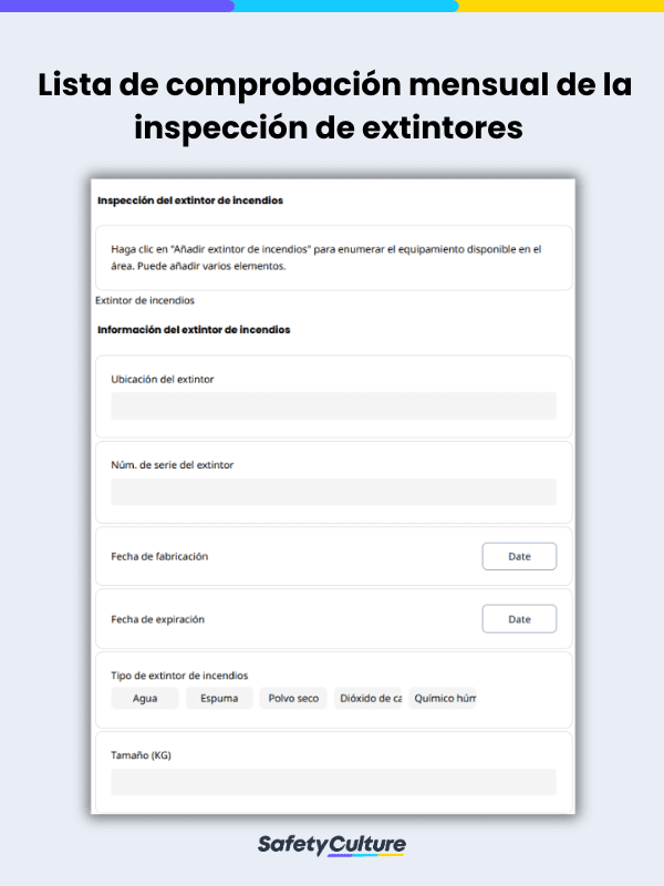 Una lista de comprobación de extintores es una herramienta que utilizan los responsables de seguridad y los gestores de las instalaciones cuando realizan inspecciones programadas de los extintores. También llamado formulario de inspección de extintores, permite a los inspectores registrar detalles sobre los extintores, como la etiqueta y las etiquetas de mantenimiento. También se pueden documentar otras observaciones, como la ubicación exacta y su estado actual. Los empresarios están obligados a disponer de extintores en el lugar de trabajo y a hacerlos inspeccionar cada mes. Así se reducen los riesgos, se evitan los problemas y las lesiones en caso de que se necesite un extintor. Siga todos los pasos de la lista de comprobación para realizar una inspección exhaustiva y una documentación adecuada.