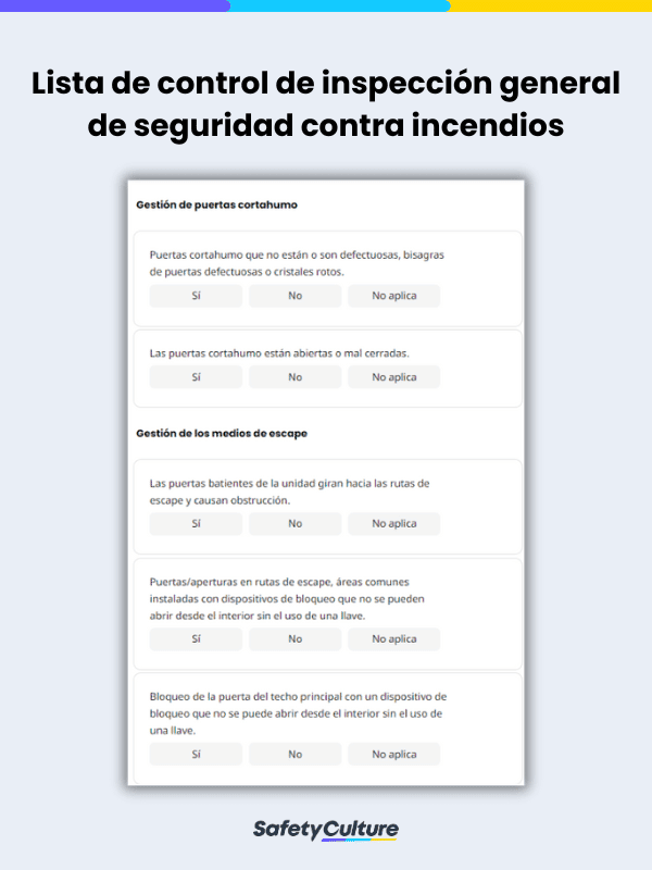Para prevenir incidentes por incendio, los controles de seguridad contra incendios son estrategias clave para mantener a raya los riesgos de incendio. Con el uso de listas de control de inspección de seguridad contra incendios, las revisiones regulares de seguridad contra incendios ayudan a cumplir con los códigos nacionales en este asunto. Las infracciones al código de incendios no solo dan lugar a sanciones graves, sino que también reflejan el nivel de compromiso de la gerencia. Las revisiones de seguridad contra incendios también ayudan a generar datos vitales para desarrollar las medidas de seguridad adecuadas para el plan de seguridad contra incendios del edificio.
