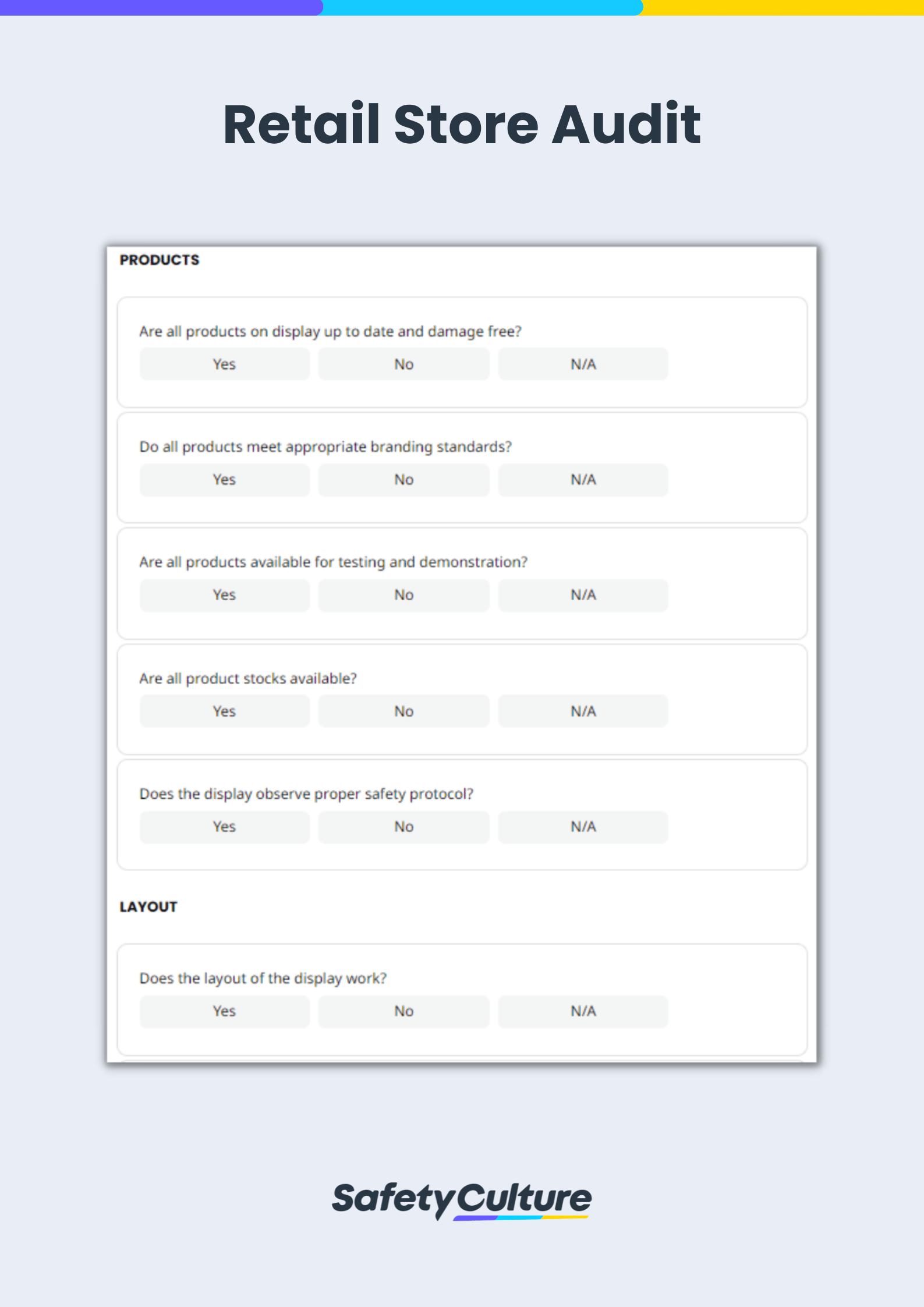 Les listes de vérification des magasins de détail sont des outils utiles qui permettent de contrôler et de surveiller efficacement le statut, l’image de marque, les processus et la normalisation des points de vente au détail. Elles sont utilisées par les directeurs ou les auditeurs des magasins pour (a) évaluer l’efficacité des étalages des magasins, (b) suivre l’inventaire des produits, (c) observer la performance et la productivité des employés des magasins, et (d) assurer la propreté et la sécurité du magasin.