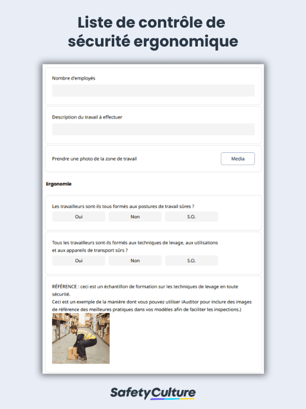Utiliser une liste de contrôle pour l’évaluation ergonomique L’utilisation d’une liste de contrôle ergonomique peut aider à s’assurer que tous les aspects de l’espace de travail, la routine réelle de l’exécution du travail et l’utilisation des outils et équipements sont vérifiés pour les risques ergonomiques possibles. Les problèmes urgents constatés doivent être enregistrés et résolus immédiatement afin d’éviter les blessures.